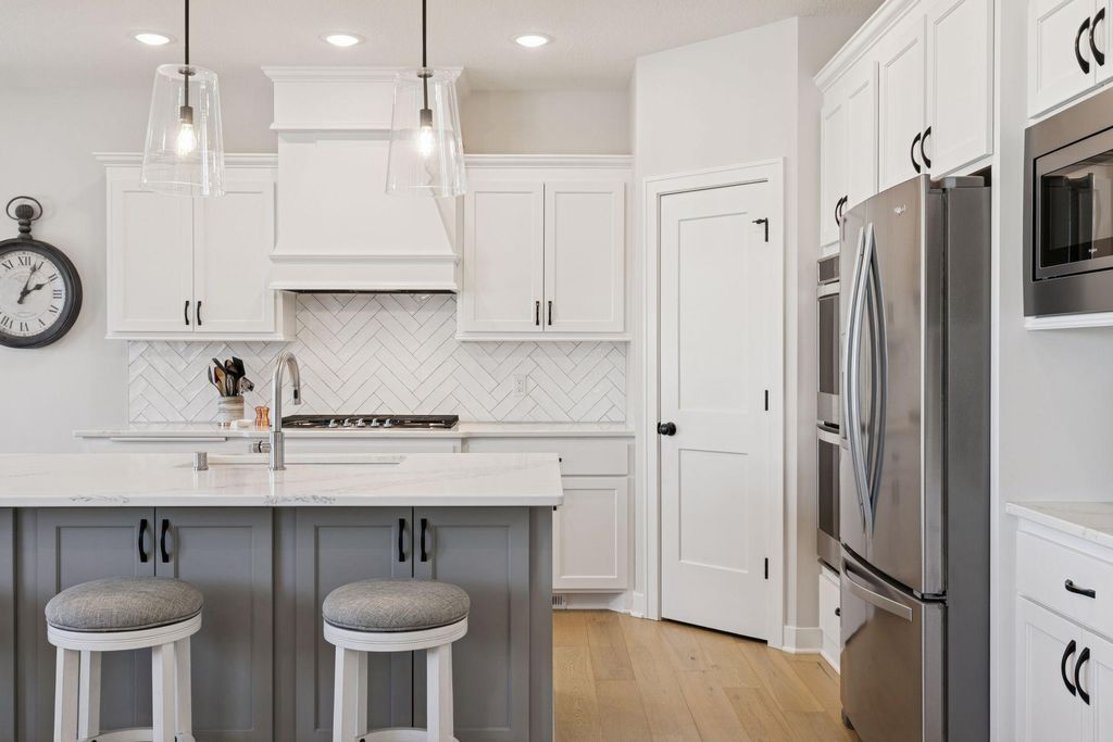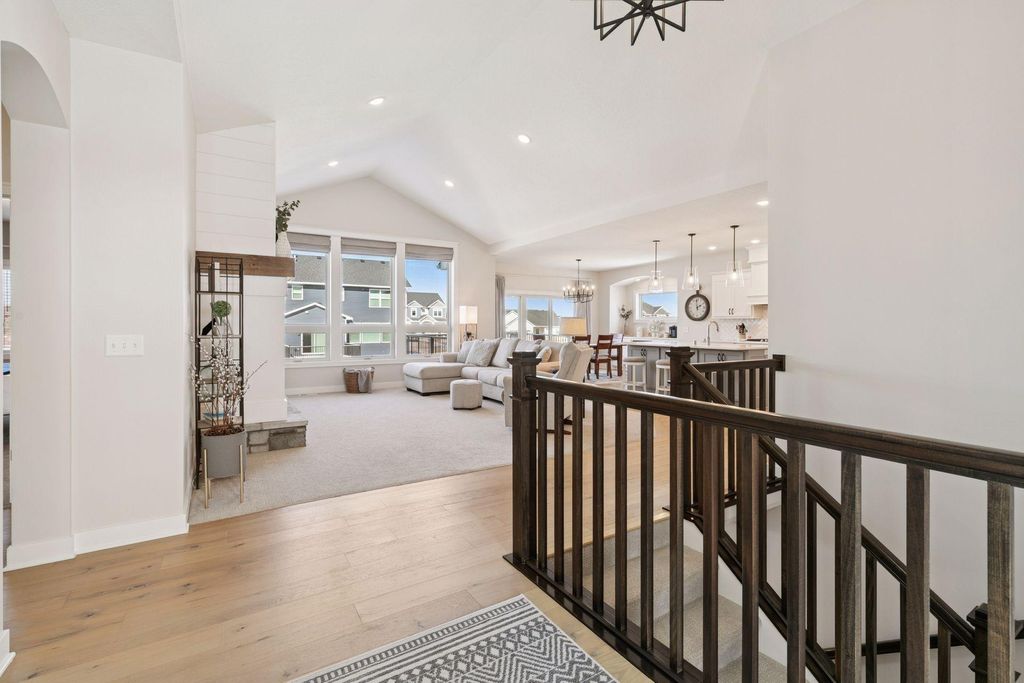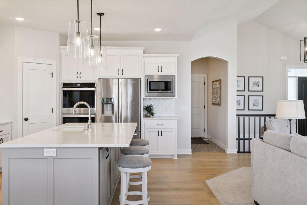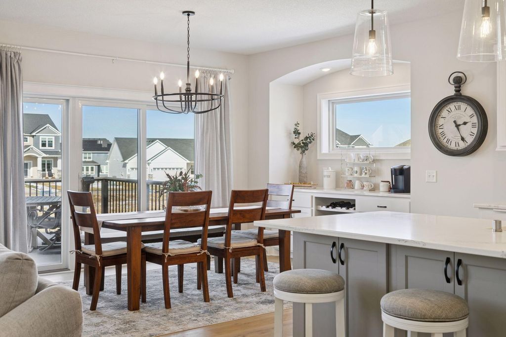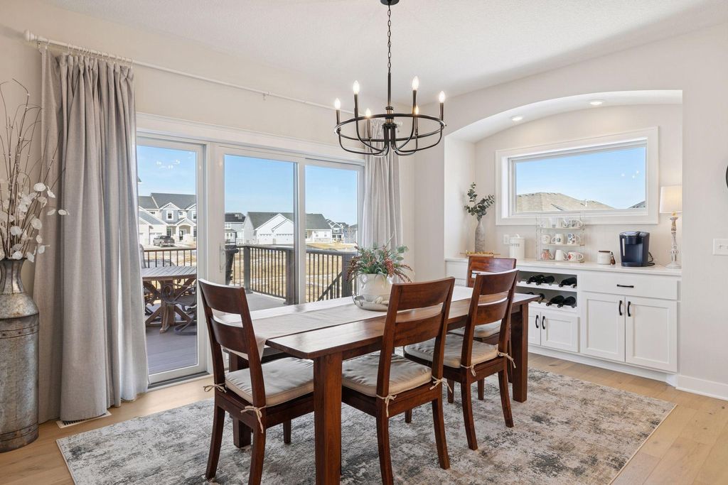 Experience refined main-level living in this beautifully designed home set on a private lot at the end of a low-traffic street, bordered by peaceful country views. From the moment you step inside, you’ll appreciate the thoughtful layout, bright open spaces, and modern finishes designed for both entertaining and everyday comfort. Large windows on both levels flood the home with natural light, highlighting the hand-scraped birch hardwood floors on the main level and gleaming granite countertops throughout. In the heart of the home, the vaulted great room is a stunning focal point, featuring a stone and shiplap surround gas fireplace that creates warmth and character next to the gourmet kitchen, where a generous center island, walk-in pantry, double wall ovens, and gas cooktop can be checked off your list. Just beyond, the spacious informal dining area includes a built-in buffet and easy access to the maintenance-free deck with a drink rail and staircase—perfect for grilling, relaxing, or hosting while enjoying serene backyard views. Also be pleased to find three bedrooms and two full baths on the main level, including the large Owner’s Suite with a walk-in closet and private bath retreat, not to mention a well-appointed laundry room and mudroom just off the insulated four-car attached garage. For the entertainer, the walkout lower level is a dream come true with its stunning family room featuring a second stone surround gas fireplace, wet bar/kitchenette with open dining space, and a game area, where you can step outside to the impressive stamped concrete patio. With two additional bedrooms and a full bath, this level is also ideal for multi-generational living and provides options for an office, exercise or hobby room. Located just 1-2 miles from Cub Foods, Heritage Library, and vibrant downtown Lakeville with its restaurants and coffee shops, this home also offers convenient access to schools and I-35 in under 10 minutes. Set in a welcoming, active neighborhood, this exceptional property blends comfort, style, and location into one remarkable opportunity.